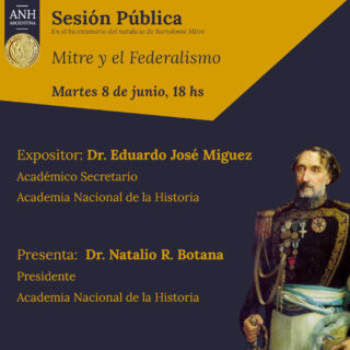 Disertación: Mitre y el Federalismo, por el académico Secretario, Dr. Eduardo José Miguez. Presentación a cargo del Presidente de la Academia, Dr. Natalio R. Botana. Los esperamos el martes 8 de junio, 18 hs. La transmisión será en vivo, mediante nuestros canales de YouTube y Facebook: