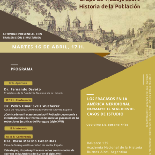 El martes 16 de abril, por invitación del Grupo de Trabajo sobre Historia de la Población de la Academia Nacional de la Historia, el Dr. Pedro Omar Svriz Wucherer (Casa de Vélazquez/Universidad Pablo de Olavide) y la Dra. Rocío Moreno Cabanillas (Casa de Vélazquez/Universidad de Sevilla)...